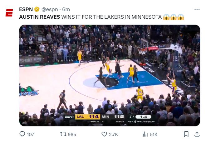 拒绝逆转!里夫斯28+16送绝杀球,湖人险胜森林狼兰德尔33+5+6